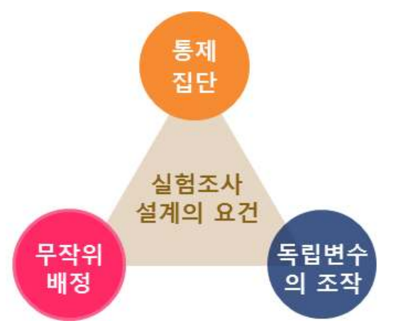 - 실험조사설계의 요건 : 통제집단, 무작위 배정, 독립변수의 조작