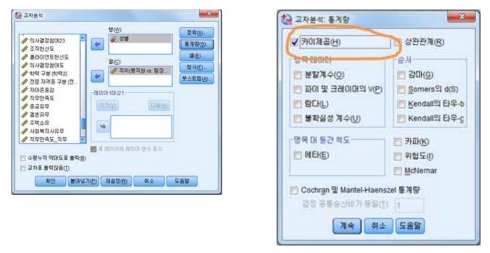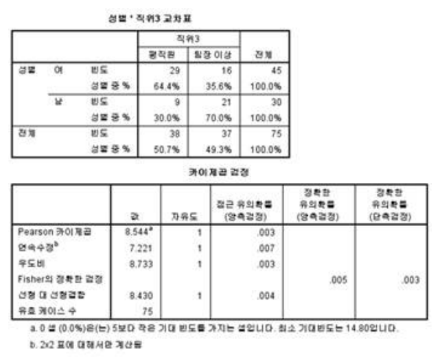 - 예 : 사회복지기관 직원의 성별과 직위 간의 관계 검증
