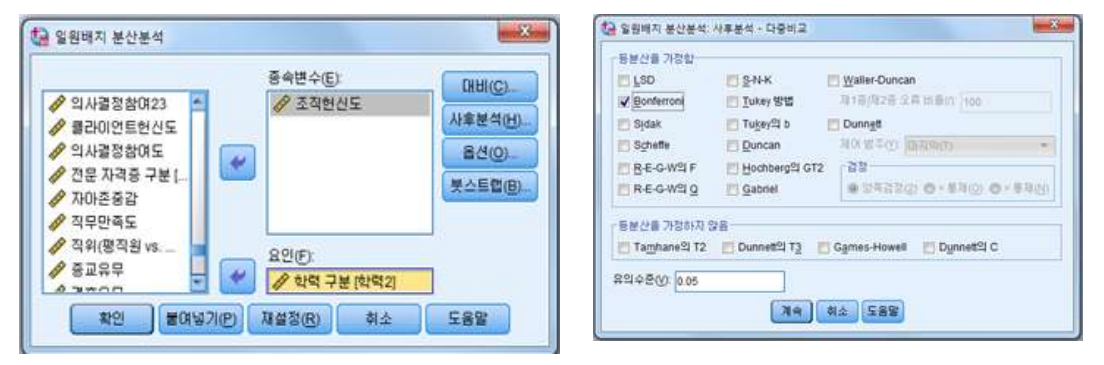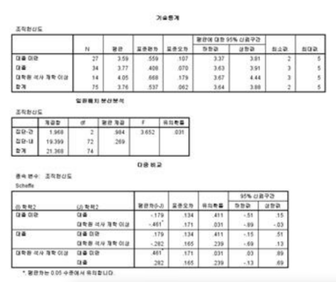 - 예 : 학력에 따른 조직헌신도의 차이에 대한 일원분산분석