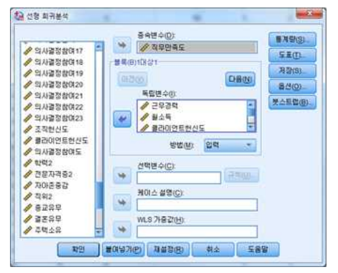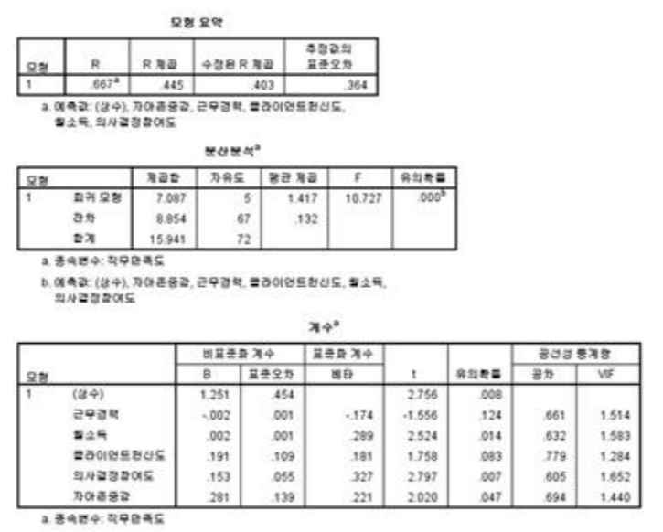 - 예 : 직원들의 소득, 근무년수, 헌신도 등이 직무만족도에 미치는 영향