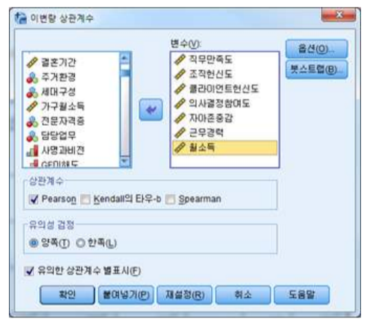 - 예 : 사회복지사의 소득과 직무만족도 간의 상관관계 검증