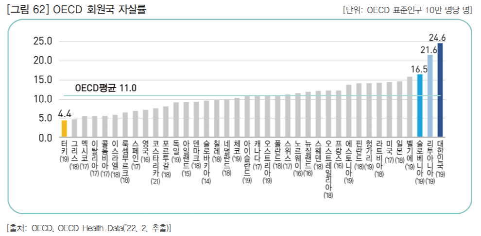 OECD 회원국의 최근 자살률(OECD 표준인구 10만 명당 명) 평균은 11.0명이고, 한국의 연령 표준화 자살률은 24.6명(’19년)으로 가장 높은 자살률을 보이고 있으며, OECD 평균보다 2.2배 높다. 뒤이어 리투아니아가 21.6명(’19년)으로 2위, 슬로베니아가 16.5명(’19년)으로 3위이고, 자살률이 가장 낮은 국가는 터키로 4.4명(’19년)이다. 이 밖에 벨기에는 15.9명(’19년)으로 4위, 일본은 14.7명 (’18년)으로 5위, 미국은 14.5명(’17년)으로 6위, 라트비아 14.3명(’18년)으로 7위, 영국은 7.3명 (’16년)으로 30위이다.