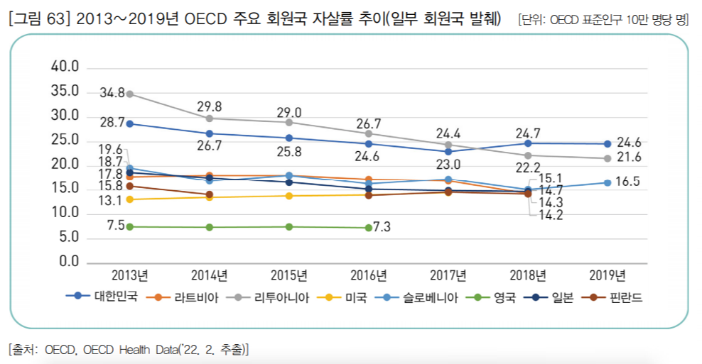 OECD 주요 회원국의 자살률 추이를 보면, 2011년에는 한국이 OECD 주요 회원국 중 가장 높았으나 한국의 자살률이 감소하고 리투아니아는 2013년 34.8명으로 최고치를 기록하여 2013~2017년에는 리투아니아가 한국보다 높았다. 이후 한국의 자살률이 증가하여 2018년과 2019년에는 한국이 가장 높았다. 라트비아는 2013년에 17.8명, 2014~2015년 18.1명으로 증가하였지만 2016년부터 감소하고 있으며, 슬로베니아는 증감을 반복하고 있으며 2019년에는 전년 대비 1.4명 증가하였다. 이 밖에 일본은 지속해서 감소하여 2018년에는 2013년 대비 4.0명(-21.4%) 감소하였고, 미국은 꾸준히 증가하여 2017년에는 2013년 대비 1.4명(10.7%) 증가하였다. 핀란드는 2017년에 전년 대비 증가하였으나 2013년부터 2018년까지 전반적인 감소추세이다. 영국은 약 7명을 유지하고 있다.