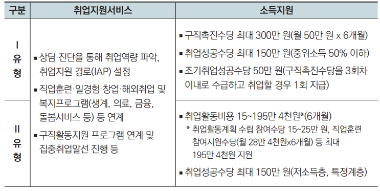 개인별 취업활동계획에 따라 단계별 맞춤형 취업지원과 함께 각종 수당을 지급하는 통합 취업지원프로그램