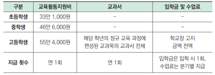 교육활동지원비, 교과서비, 입학금 및 수업료 지원
