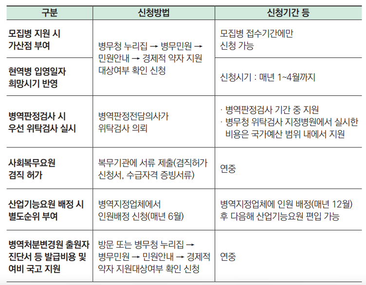 경제적, 신체적 어려움 또는 생계 곤란 등으로 발생할 수 있는 병역 관련 문제를 해소할 수 있도록 지원합니다.