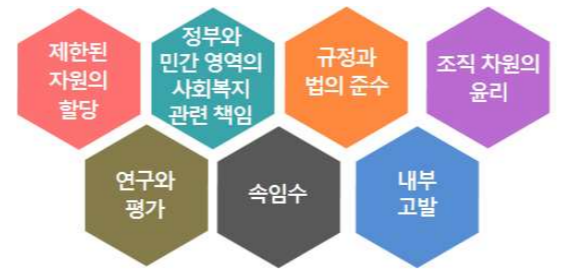 | 윤리적 딜레마 | · 결과의 모호성 직접적인실천 차원의 갈등 · 사회복지정책 및 프로그램차원의 갈등 · 사회복지 조직체 및 동료 사회복지사와 관련된 윤리적 갈등 |