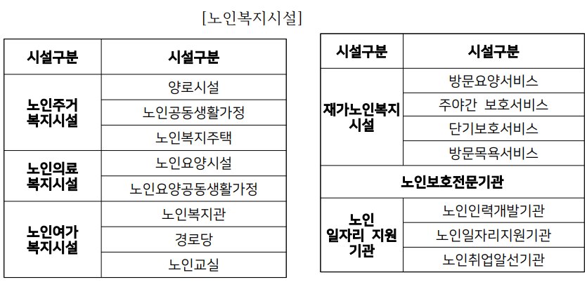 · 내용 : 재가노인복지서비스, 시설보호서비스, 노인보호전문기관, 노인장기요양보험, 노인여가복지서비스