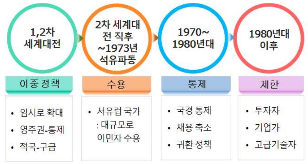 - 자국의 경제적·정치적 상황에 따라 항상 변화 가능성을 가짐➠ 자국의 이익에 따라 이주민 정책 및 다문화 정책 결정 및 실행됨