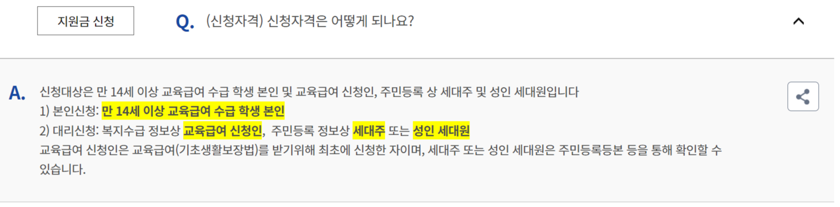 * 위 기간 중 교육급여 수급자로 선정된 이력이 있는 모든 학생 대상 지원