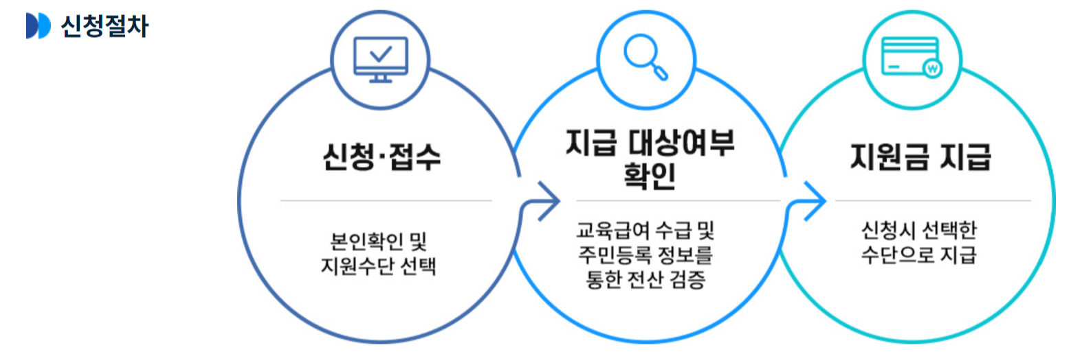본인확인(휴대폰 인증 등), 교육급여 수급자 정보를 입력 후 지원수단을 선택하여 신청