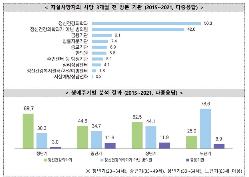 ○ 한편 중·장년기 자살사망자의 경우 약 12% 정도가 병·의원 외에 금융기관을 방문한 것으로 나타났다.