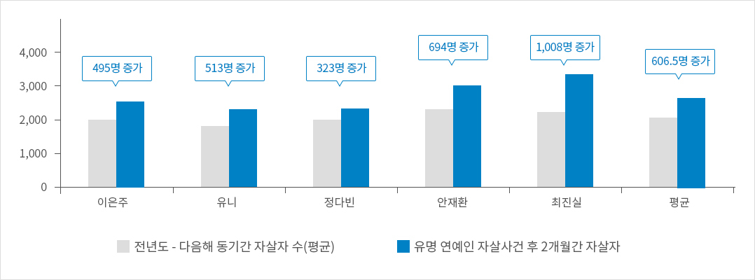 유명인 자살 이후 2달간 자살자 수의 증가 양상을 보면 최고 1,000명, 평균적으로 600명 정도가 증가했다고 볼 수 있습니다.